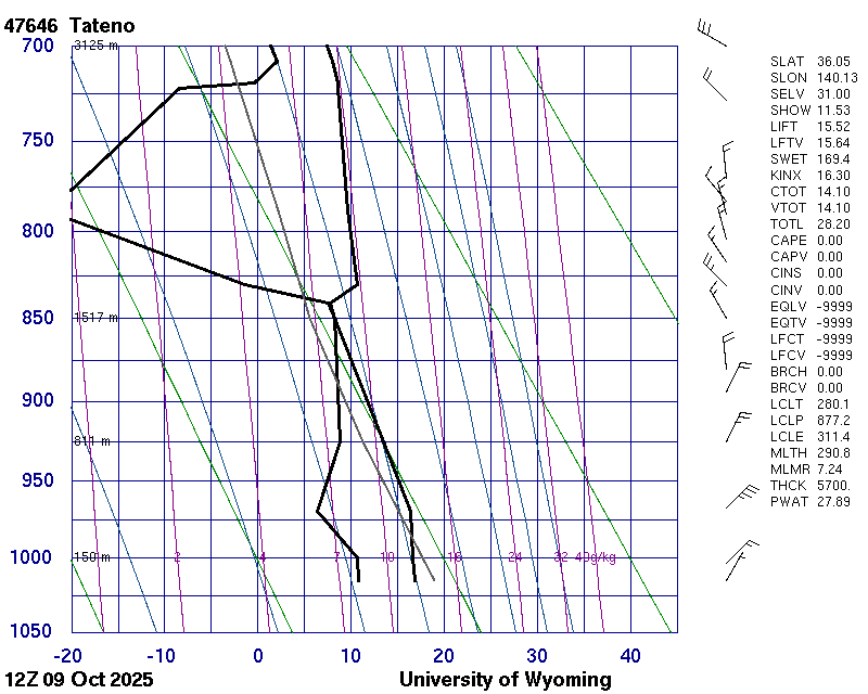 Station number: 47646 Observation time: 251009/1200 Station latitude: 36.05 Station longitude: 140.13 Station elevation: 31.0 Showalter index: 11.53 Lifted index: 15.52 LIFT computed using virtual temperature: 15.64 SWEAT index: 169.40 K index: 16.30 Cross totals index: 14.10 Vertical totals index: 14.10 Totals totals index: 28.20 Convective Available Potential Energy: 0.00 CAPE using virtual temperature: 0.00 Convective Inhibition: 0.00 CINS using virtual temperature: 0.00 Bulk Richardson Number: 0.00 Bulk Richardson Number using CAPV: 0.00 Temp [K] of the Lifted Condensation Level: 280.11 Pres [hPa] of the Lifted Condensation Level: 877.23 Equivalent potential temp [K] of the LCL: 311.48 Mean mixed layer potential temperature: 290.81 Mean mixed layer mixing ratio: 7.24 1000 hPa to 500 hPa thickness: 5700.00 Precipitable water [mm] for entire sounding: 27.89