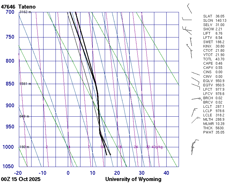 Station number: 47646 Observation time: 251015/0000 Station latitude: 36.05 Station longitude: 140.13 Station elevation: 31.0 Showalter index: 2.21 Lifted index: 6.76 LIFT computed using virtual temperature: 6.54 SWEAT index: 186.21 K index: 30.80 Cross totals index: 21.80 Vertical totals index: 21.90 Totals totals index: 43.70 Convective Available Potential Energy: 0.46 CAPE using virtual temperature: 0.55 Convective Inhibition: 0.00 CINS using virtual temperature: 0.00 Equilibrum Level: 950.93 Equilibrum Level using virtual temperature: 950.58 Level of Free Convection: 977.95 LFCT using virtual temperature: 978.67 Bulk Richardson Number: 0.02 Bulk Richardson Number using CAPV: 0.02 Temp [K] of the Lifted Condensation Level: 287.17 Pres [hPa] of the Lifted Condensation Level: 978.67 Equivalent potential temp [K] of the LCL: 318.21 Mean mixed layer potential temperature: 288.96 Mean mixed layer mixing ratio: 10.39 1000 hPa to 500 hPa thickness: 5630.00 Precipitable water [mm] for entire sounding: 35.05