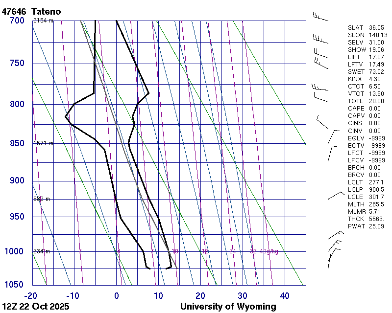 Station number: 47646 Observation time: 251022/1200 Station latitude: 36.05 Station longitude: 140.13 Station elevation: 31.0 Showalter index: 19.06 Lifted index: 17.07 LIFT computed using virtual temperature: 17.49 SWEAT index: 73.02 K index: 4.30 Cross totals index: 6.50 Vertical totals index: 13.50 Totals totals index: 20.00 Convective Available Potential Energy: 0.00 CAPE using virtual temperature: 0.00 Convective Inhibition: 0.00 CINS using virtual temperature: 0.00 Bulk Richardson Number: 0.00 Bulk Richardson Number using CAPV: 0.00 Temp [K] of the Lifted Condensation Level: 277.14 Pres [hPa] of the Lifted Condensation Level: 900.52 Equivalent potential temp [K] of the LCL: 301.72 Mean mixed layer potential temperature: 285.58 Mean mixed layer mixing ratio: 5.71 1000 hPa to 500 hPa thickness: 5566.00 Precipitable water [mm] for entire sounding: 25.09