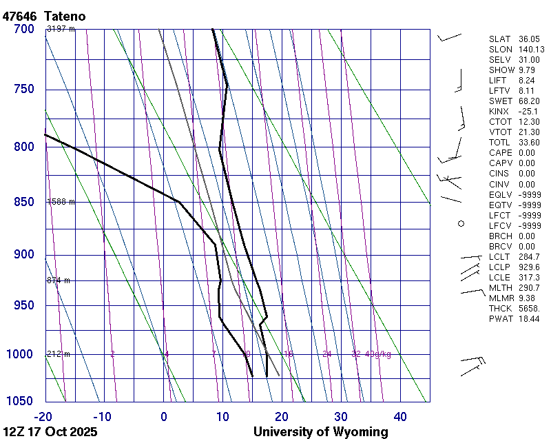 ----------------------------------------------------------------------------- PRES HGHT TEMP DWPT RELH MIXR DRCT SKNT THTA THTE THTV hPa m C C % g/kg deg knot K K K ----------------------------------------------------------------------------- 1005.0 16 28.4 26.3 88 22.02 140 7 301.1 366.4 305.1 1000.0 58 28.4 24.9 81 20.31 150 5 301.6 361.8 305.2 973.0 301 26.9 23.2 80 18.81 145 14 302.4 358.2 305.7 962.0 402 26.2 22.5 80 18.21 135 12 302.7 356.9 306.0 950.0 513 27.2 16.2 51 12.34 124 10 304.8 341.9 307.0 942.0 588 26.2 21.2 74 17.15 116 9 304.5 355.9 307.6 941.0 597 26.2 21.1 73 17.04 115 9 304.6 355.7 307.7 925.0 749 26.2 19.2 65 15.38 70 8 306.1 352.5 308.9 923.0 768 26.0 19.0 65 15.22 68 9 306.1 352.0 308.9 909.0 902 24.8 18.5 68 15.01 55 12 306.2 351.5 308.9 850.0 1491 19.6 16.5 82 14.09 70 14 306.7 349.3 309.2 849.0 1501 19.6 16.5 82 14.11 70 14 306.8 349.5 309.4 820.0 1796 18.1 14.4 79 12.78 80 13 308.2 347.2 310.6 792.0 2092 16.6 12.4 76 11.56 120 8 309.7 345.2 311.9 764.0 2397 15.1 10.3 73 10.39 110 8 311.3 343.5 313.2 738.0 2691 13.6 8.2 70 9.36 125 12 312.7 342.0 314.5 708.0 3044 11.8 5.8 67 8.23 133 14 314.5 340.5 316.1 700.0 3139 12.0 -1.0 41 5.11 135 15 315.7 332.3 316.7 687.0 3295 10.9 -0.1 47 5.55 130 15 316.2 334.1 317.2 662.0 3603 8.6 1.6 61 6.53 110 12 317.0 338.0 318.2 655.0 3691 9.0 -6.0 34 3.75 104 11 318.4 330.9 319.1 639.0 3894 7.5 -2.9 48 4.85 90 9 318.9 334.9 319.9 624.0 4090 6.0 0.0 65 6.17 93 12 319.4 339.5 320.6 603.0 4369 4.2 -0.8 70 6.02 98 15 320.5 340.2 321.6 594.0 4491 3.8 -4.7 54 4.55 100 17 321.4 336.6 322.3 588.0 4574 3.6 -7.4 44 3.75 98 17 322.1 334.7 322.8 575.0 4755 2.4 -4.6 60 4.75 94 17 322.8 338.6 323.7 555.0 5039 1.0 -20.0 19 1.42 88 18 324.4 329.4 324.6 542.0 5229 0.4 -29.6 8 0.61 84 18 325.9 328.2 326.0 536.0 5318 0.0 -28.0 10 0.72 82 18 326.4 329.1 326.6 532.0 5378 -0.5 -24.5 14 0.99 81 18 326.5 330.2 326.7 524.0 5499 -1.5 -12.5 43 2.81 78 18 326.7 336.5 327.3 500.0 5870 -3.5 -20.5 26 1.51 70 19 328.7 334.2 329.0 494.0 5965 -4.3 -24.3 19 1.09 70 19 328.9 332.9 329.1 492.0 5997 -4.5 -25.0 18 1.03 70 19 329.0 332.8 329.2 457.0 6574 -7.9 -37.9 7 0.32 79 17 331.8 333.0 331.8 454.0 6625 -8.1 -28.1 18 0.84 80 16 332.1 335.3 332.3 432.0 7010 -9.3 -38.3 7 0.33 87 15 335.4 336.7 335.4 421.0 7208 -10.6 -42.0 6 0.23 90 14 336.1 337.1 336.2 400.0 7600 -13.3 -49.3 3 0.11 105 14 337.6 338.1 337.6 390.0 7789 -14.7 -47.3 4 0.14 95 13 338.2 338.8 338.2 360.0 8386 -19.3 -40.9 13 0.30 80 10 339.9 341.1 339.9 338.0 8857 -22.9 -35.9 29 0.53 76 6 341.2 343.3 341.3 332.0 8988 -23.7 -37.7 26 0.45 75 5 341.8 343.7 341.9 326.0 9121 -24.5 -39.5 24 0.38 67 5 342.5 344.1 342.6 306.0 9578 -28.1 -38.1 38 0.47 39 7 343.7 345.6 343.8 300.0 9720 -29.3 -40.3 34 0.38 30 7 344.0 345.5 344.1 293.0 9887 -30.5 -42.7 29 0.30 20 7 344.6 345.9 344.7 280.0 10208 -32.7 -47.2 22 0.19 25 6 345.9 346.7 345.9 269.0 10491 -34.7 -51.2 17 0.13 345 4 346.9 347.5 347.0 266.0 10570 -35.3 -52.3 16 0.11 343 6 347.2 347.7 347.3 257.0 10809 -37.2 -54.2 15 0.09 335 11 347.9 348.3 347.9 250.0 11000 -38.7 -55.7 15 0.08 330 10 348.4 348.8 348.4 236.0 11390 -42.2 -56.0 21 0.08 330 7 348.9 349.3 349.0 224.0 11744 -45.3 -56.3 28 0.08 316 7 349.4 349.8 349.4 215.0 12014 -47.7 -58.3 28 0.07 305 7 349.8 350.1 349.8 206.0 12295 -50.2 -60.4 29 0.05 315 10 350.2 350.4 350.2 200.0 12490 -51.9 -61.9 29 0.05 315 9 350.4 350.6 350.4 196.0 12620 -52.9 -64.3 24 0.03 325 9 350.9 351.0 350.9 188.0 12888 -55.0 -69.2 15 0.02 0 11 351.7 351.8 351.7 186.0 12956 -55.5 -70.5 14 0.02 7 11 351.9 352.0 351.9 179.0 13194 -57.6 -71.3 16 0.01 30 13 352.4 352.5 352.4 155.0 14088 -65.5 -74.3 28 0.01 55 16 353.8 353.8 353.8 151.0 14250 -66.9 -74.9 31 0.01 55 16 354.0 354.0 354.0 150.0 14290 -67.3 -75.3 31 0.01 55 16 354.0 354.0 354.0 126.0 15292 -75.2 -84.1 24 0.00 50 25 357.7 357.8 357.7 120.0 15572 -77.4 -86.5 22 0.00 55 29 358.7 358.7 358.7 108.0 16178 -82.2 -91.8 18 0.00 65 29 360.6 360.6 360.6 102.0 16506 -84.8 -94.7 16 0.00 70 31 361.6 361.6 361.6 100.0 16620 -85.7 -95.7 16 0.00 60 29 361.9 361.9 361.9 99.9 16626 -84.7 -94.7 16 0.00 363.9 363.9 363.9